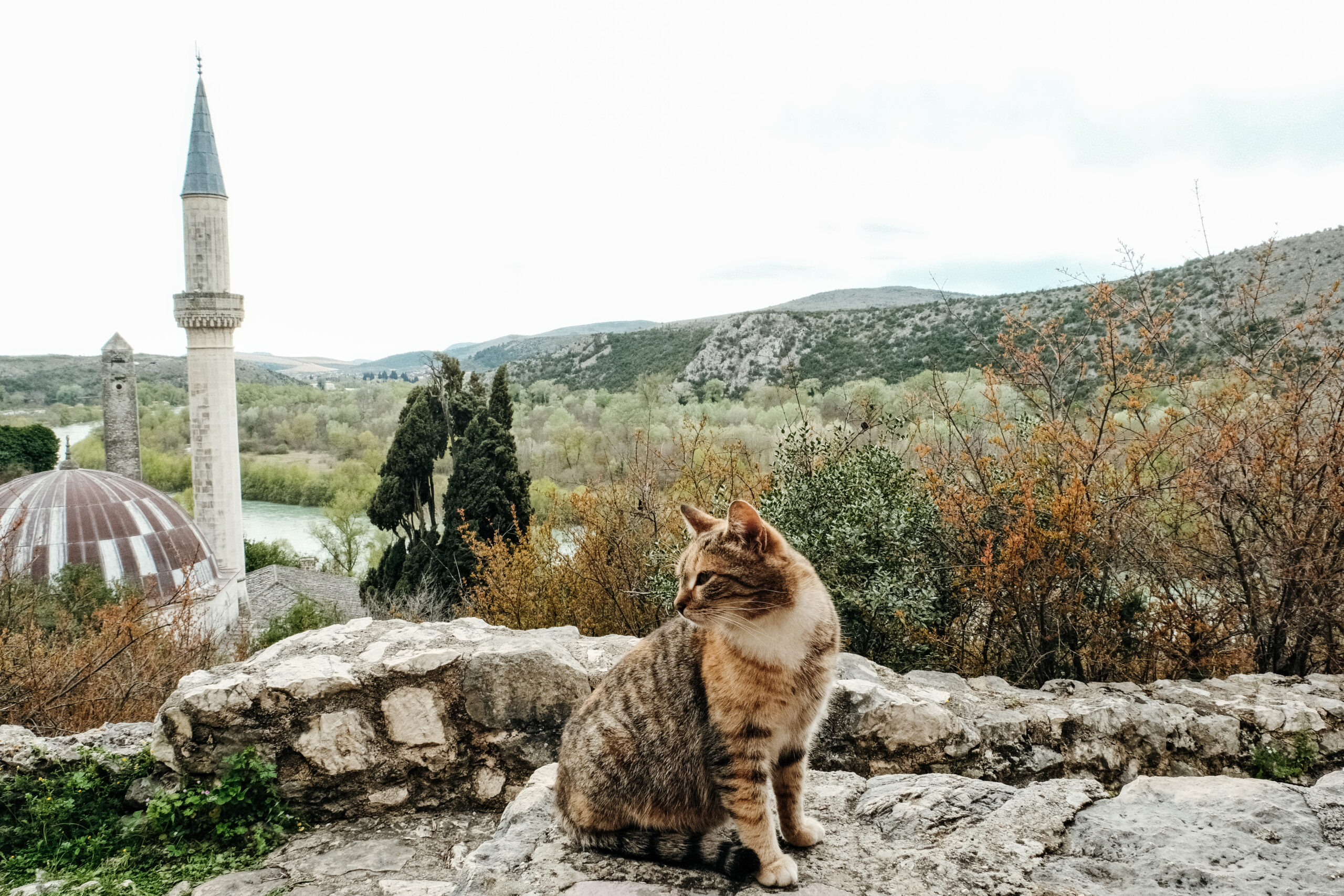 After Krka, we were headed to spend the night in Mostar, one of the most magical old towns I’ve visited to date. On the way, we pulled over to explore Počitelj, a town that was likely built in the 1380s. It’s some of the best preserved architecture in the area, and is open to visitors and kittens alike. Arriving there, the atmosphere completely shifted: spires reached for the sky, and once again the building materials changed into a gray stone.